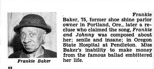 Motion picture treatments of the “Frankie and Johnny” story came out during Frankie Baker’s lifetime. These brought her renewed and unwelcome notoriety, and made money for others at her expense. Brown notes that at one trial, the defense called “Sigmund Spaeth, an authority on popular songs and ballads. Fifteen years before, in 1927, Spaeth had written a book in which he stated that the ballad ‘Frankie and Johnny’ was based on the Frankie Baker incident…. Now, after receiving an expert witness fee of $2,000, Spaeth took the opposite position, claiming that the song had not originated in St. Louis and that Frankie Baker had not inspired its creation.” Brown notes that the trial played out along unsurprising racial lines, and that Baker came out on the short end.