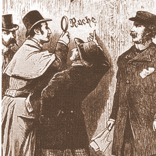 Sherlock Holmes examines a clue in the murder of two Mormon militiamen. Illustration from A Study in Scarlet (1887) by Sir Arthur Conan Doyle.