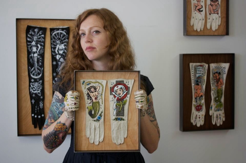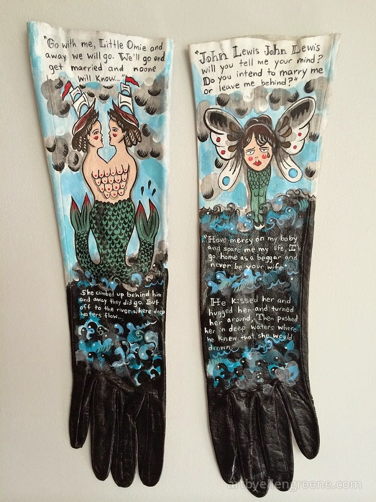 “I paint on vintage women’s gloves in a tattoo-inspired folk/outsider style and I usually incorporate bits of music, poetry, or phrasing in the images. I did a pair of gloves in 2011 titled “Omie Wise” inspired by the murder ballad. I have been wanting to do a whole series on the murder ballad specifically sweetheart murders and happy to say it is under way.”