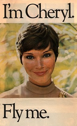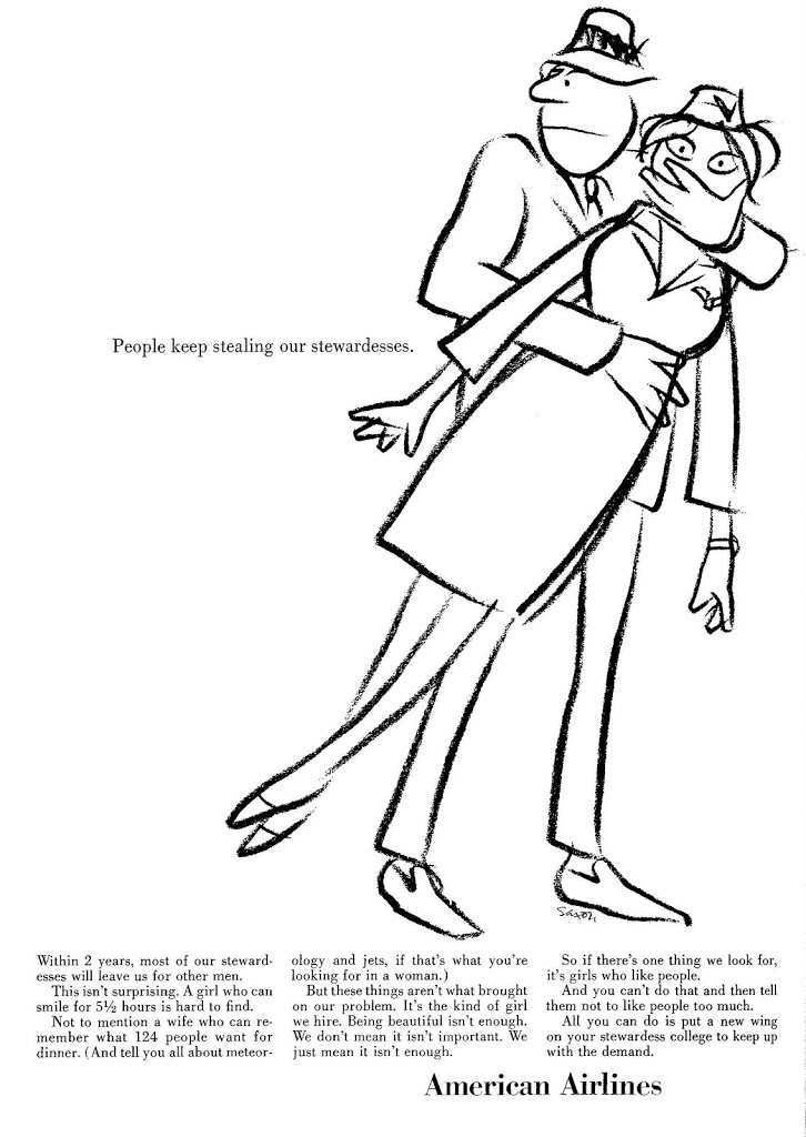 Yes, folks, this is a real American Airlines ad from 1968. And, yes, the ad copy does say (among other gems): “Being beautiful is not enough. A girl has to have that special attitude. If she does, you get that special service. If she doesn’t, we both pay.” What that means, I don’t know and don’t want to know.A cartoon version of the same campaign depicts the fate of those fortunate ladies who do have that special attitude and therefore don’t have to “pay”. But to me it looks like what they get in the end is something equal to worse: