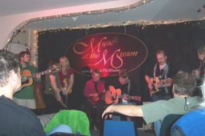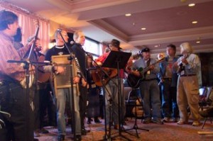 There was no time to do an official rehearsal. In the weeks preceeding the event, a flurry of e-mails between the artists and myself determined who would be singing what songs. Some musicians had specific requests, others agreed to songs that I suggested. All of the artists rehearsed the songs on their own time and then we met one hour before the event to simply walk through. At that point, musicians were volunteering to help out with mandolin and banjo parts or vocal accompaniment. Tom made some great suggestions for instrumental bridges to accompany the narration.