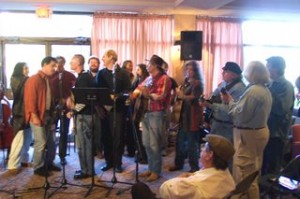 One of the more memorable showcases I attended was in a room sponsored by Music at The Mission, a venue from West Milford, NJ . The room was decked out in it’s Mardi-Gra finest with lights and their banner giving it a really cozy feeling. I sat in on a round robin showcase that featured the McDades, Terence Martin and Amy Speace. Each artist would take turns doing a song, but it was the made up on the spot accompaniment and harmonizing that really made for a memorable session. There is a really close knit community feeling to events like these, and even though most of the artist had met only moments before, they played like they knew each other for years. Hats off to Sara Gallman and her husband for a well thought out and well run showcase. We are lucky to have such creative people supporting folk music here in NJ! For me, the highlight of the weekend – and maybe my career in radio – was producing and directing “Bound For Glory: A Musical Tribute to Woody Guthrie” for NERFA and recording it for broadcast on WFDU-FM on Sunday November 26th at 3pm ET.