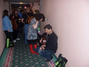 The event kicks off officially on Friday afternoon, but many people arrive Thursday night for the Folk-DJ showcase. As you are probably aware, there are a number of great radio programs similar to TRADITIONS that are heard throughout the country. Over a dozen hosts attended the conference, including Rich Warren who hosts The Midnight Special out of WFMT in Chicago, John Platt of WFUV, Gene Shay from WXPN, and Mary Sue Twohy of XM Satellite radio. On Thursday night, many of us got together and presented a showcase that featured artists who we nominated. The invitational showcase allowed us an opportunity to share “finds” – artists who we may have been playing on our programs but have not been exposed to wider audiences. This was one of the most exciting showcases of the entire conference and a wide variety of talent was heard from.