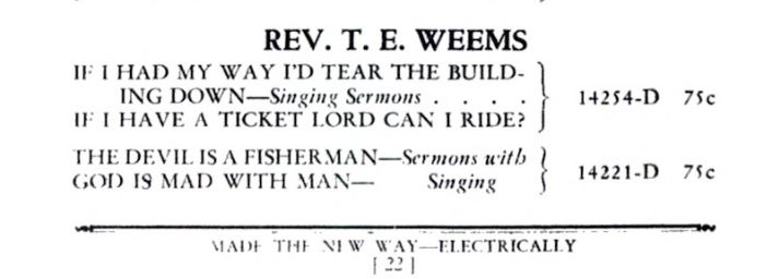 The Reverend T. E. Weems, backed with a small studio “congregation,” cut a ‘singing sermon’ version of “If I Had My Way I’d Tear the Building Down” for Columbia Records, which released the track in 1927. It’s both gritty and spiritual; I find it mesmerizing. Note here that Weems in his introduction explicitly identifies the “building” as a metaphor for “sin that troubled the Christian past.”