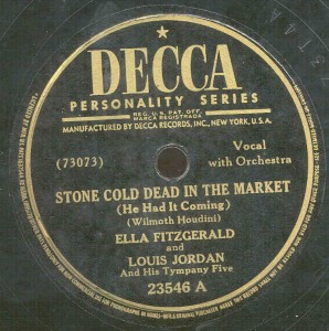 Jordan and Fitzgerald had worked together previously, as members of Chick Webb‘s band. Fitzgerald was an emerging star, and the female lead vocalist in the band. Fitzgerald and Jordan had had a romantic affair in the 30s, and Jordan had been fired from Webb’s band for trying to recruit Fitzgerald and others away to his new band. According to First Lady of Song: Ella Fitzgerald for the Record, by Geoffrey Mark Fidelman, Fitzgerald and Jordan had worked up a more elaborate arrangement of “Stone Cold Dead in the Market” for this 1946 recording, only to have it nixed by the recording label.