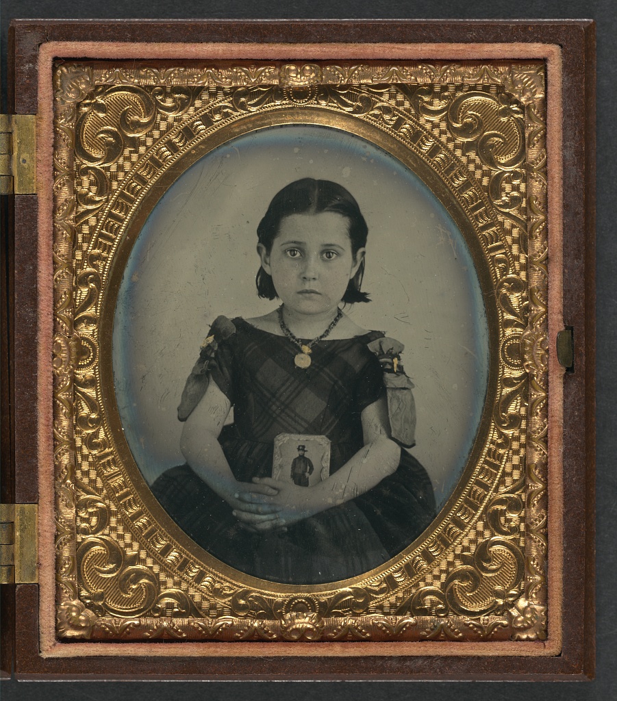 Unidentified girl in mourning dress holding framed photograph of her father as a cavalryman with sword and Hardee hat – tintype, ca. 1870, Library of Congress |
