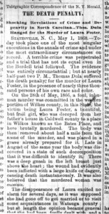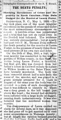 Laura Foster was missing for months before searchers found her body, decomposing in a shallow grave. Between her disappearance and this discovery, local speculation about her presumed fate apparently led Dula to skip town, fleeing to Tennessee. A few sheriff’s deputies from Wilkes County eventually went after him, and retrieved him with the help of a former Union Army officer living there, Colonel James Grayson. Dula briefly worked on Grayson’s farm, under assumed name, in order to earn enough money to replace his worn-out shoes and resume his flight. Dula was brought back to Wilkes County by the deputies and Grayson, and held in jail there while searchers continued to look for Laura’s body.