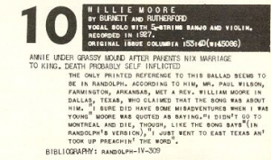 In the liner notes for the Anthology, Smith condenses the narrative in his typical way. He then notes a highly questionable story regarding an informant of Vance Randolph‘s who claimed to be *the* Willie Moore when Randolph was researching the ballad for his Ozark Folksongs, published immediately after World War II.